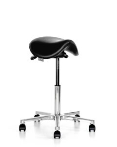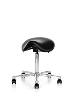 The laboratory chair Sante has a 15° seat movement, meaning it slightly balances, but this movement is not significant enough to call it a balancing chair. Such seat movement does not require the body to maintain balance. It is more helpful when needing to reach for something on the side, as you don’t have to lean over with the entire chair, only the seat moves. The eco-leather upholstered seat makes the chair more adaptable in environments where special sanitary conditions are required.